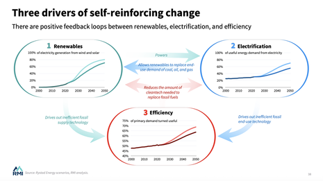 Sie funktionieren als selbstverstärkende Feedback-Schleifen. Immer günstigere Erneuerbare steigern den Grad der Elektrifizierung von Wärme, Mobilität und Industrie. Umgekehrt